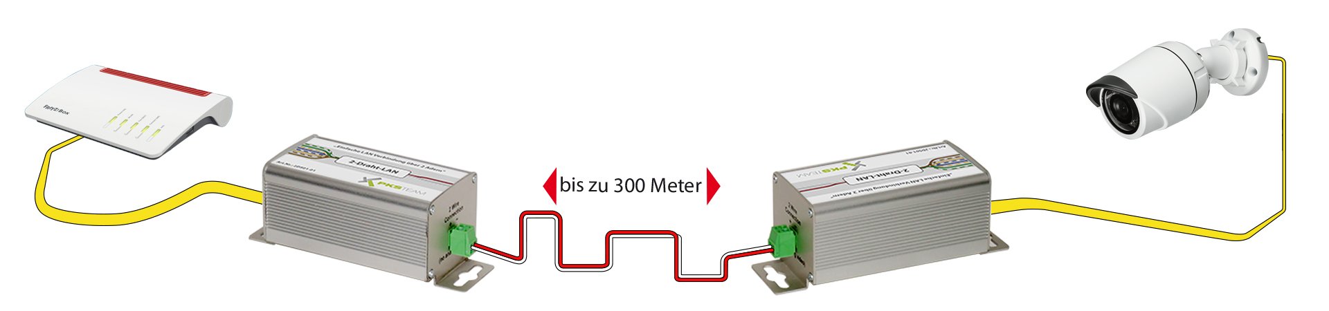 Nicht nur verwandelt das System Ihre 2 Adern in eine LAN Leitung: es liefert am Ziel auch der Norm entsprechenden Strom (PoE - Power Over Ethernet) um Ihre IP Kamera, IP Telefon, PoE Switch, IP Klingel oder andere PoE Geräte zu betreiben.